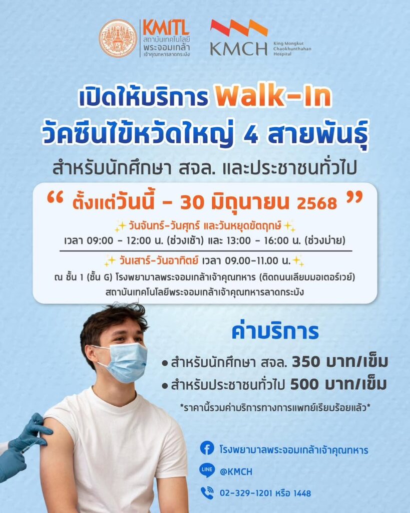 KMCH เปิดให้บริการสำหรับ #นักศึกษา สจล. #ประชาชนทั่วไป ฉีดวัคซีนไข้หวัดใหญ่ 4 สายพันธุ์ ประจำปี 2568
