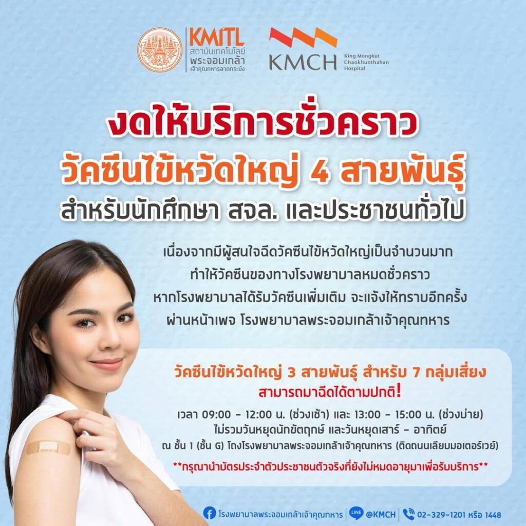 งดให้บริการ "วัคซีนไข้หวัดใหญ่ 4 สายพันธุ์" ชั่วคราว เนื่องจากวัคซีนไข้หวัดใหญ่ 4 สายพันธุ์ แบบชำระเงิน หมดชั่วคราวสำหรับนักศึกษา สจล. และประชาชนทั่วไป ที่สนใจฉีดวัคซีนไข้หวัดใหญ่ โปรดรอประกาศจากทางโรงพยาบาลอีกครั้ง วัคซีนไข้หวัดใหญ่ 3 สายพันธุ์ สำหรับ 7 กลุ่มเสี่ยง ยังคงมีวัคซีนอยู่ สามารถมาฉีดได้ตามปกติ ณ ชั้น 1 (ชั้น G) โรงพยาบาลพระจอมเกล้าเจ้าคุณทหาร (ติดถนนเลียบมอเตอร์เวย์) Map : https://g.co/kgs/9Bwvji3ด้วยความห่วงใยจาก#หมอพระจอมฯ #โรงพยาบาลพระจอมเกล้าเจ้าคุณทหาร #KMCH #KMITL #สถาบันเทคโนโลยีพระจอมเกล้าเจ้าคุณทหารลาดกระบัง #สจล